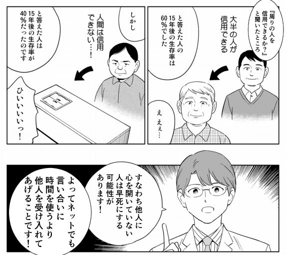 人は、周囲からも同じように信用され、愛され、結果的に友人や家族関係が充実して、安定した生活を送ることができて、最終的に健康的に長生きできる…