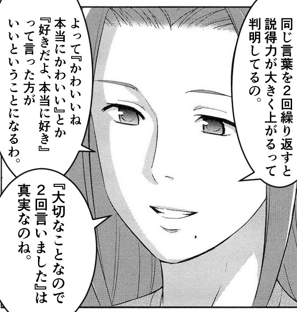 しかしそれを、疑う気持ちが出る前にニ回繰り返すことで、その信憑性がより強まって感じられるわけです。