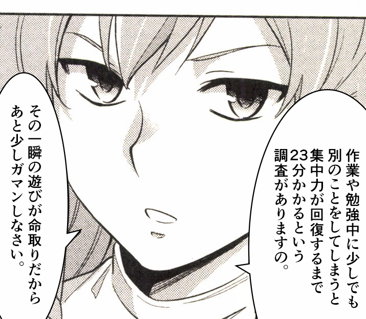 実はカリフォルニア大学アーバイン校の心理学者 グロリア・マーク博士 の研究によると、作業を中断すると 元の集中力に戻るまでに平均23分15秒もかかる ことが明らかになっています。