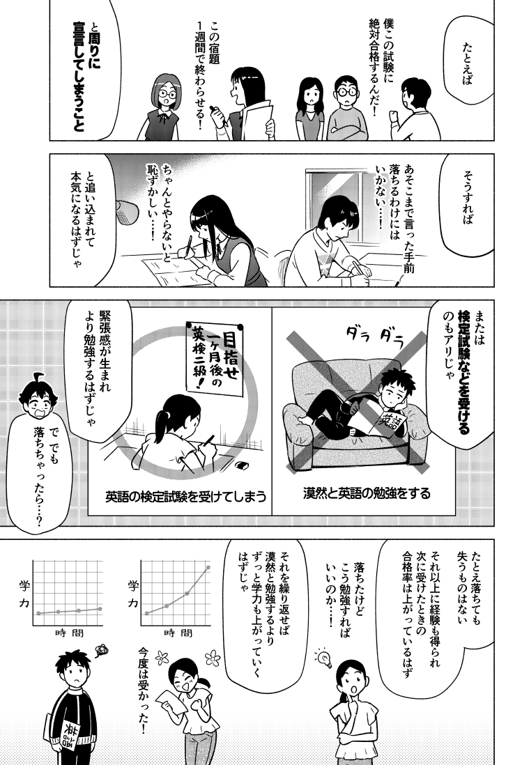 漫画の中でも、「周囲に宣言してしまう」「試験を申し込んでしまう」など、