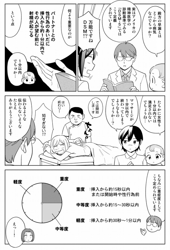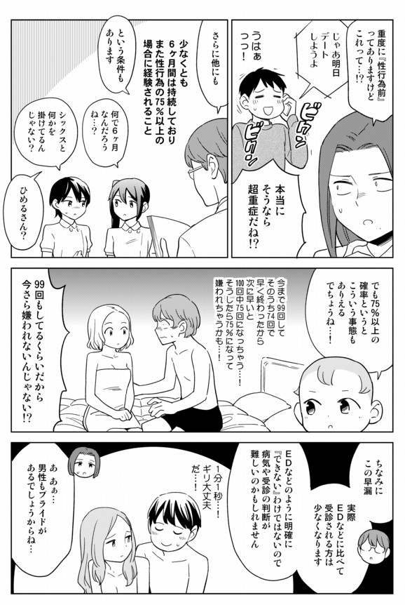 早漏(Premature Ejaculation)は「パートナーとの性交時に、挿入からおおむね1分以内に射精が起こり、